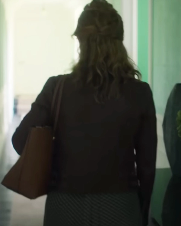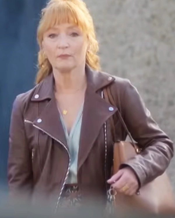 Lesley Manville TV Series Moonflower Murders 2024 Susan Ryeland Brown Leather Jacket