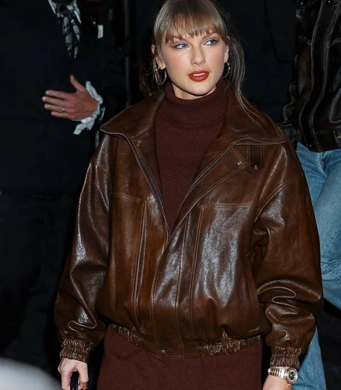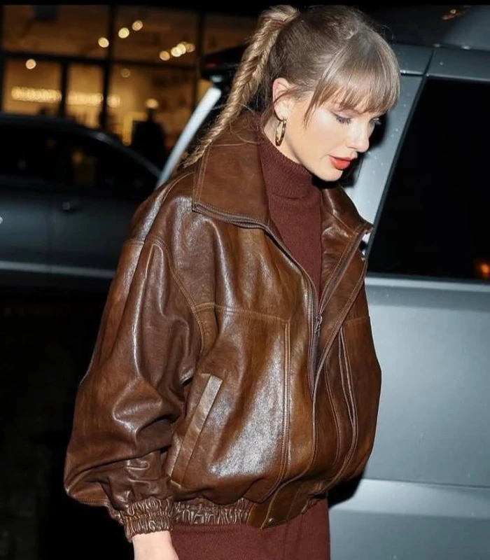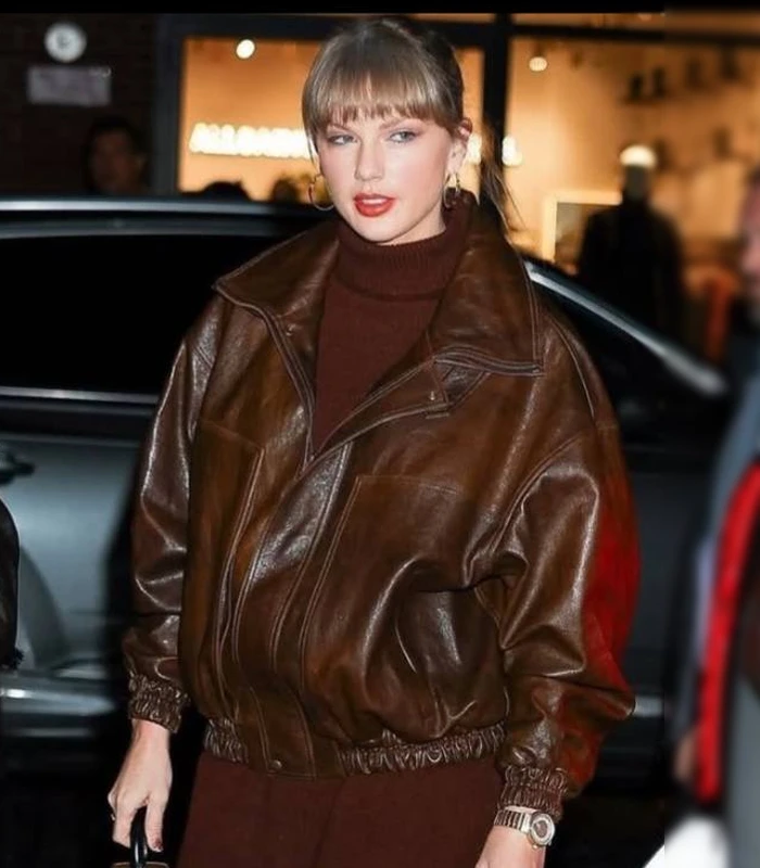 Singer Taylor Swift Night Out 2025 Brown Leather Jacket