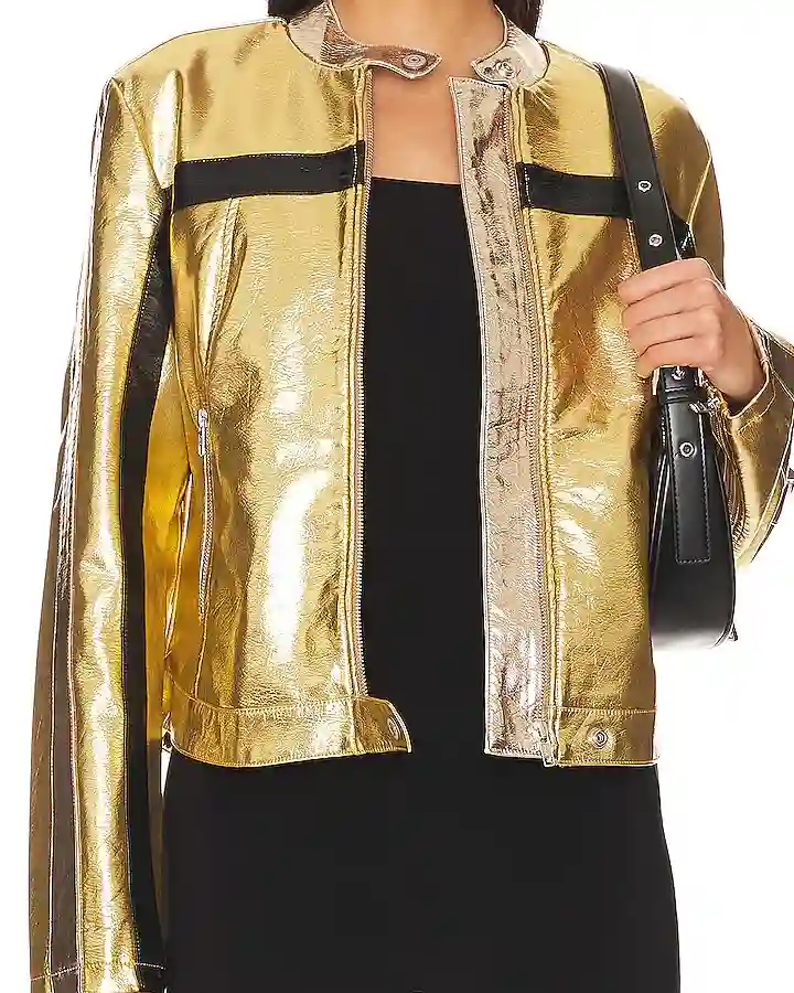 he Bachelorette Season 21 Jenn Tran Gold Metallic Stripe PU Leather Jacket