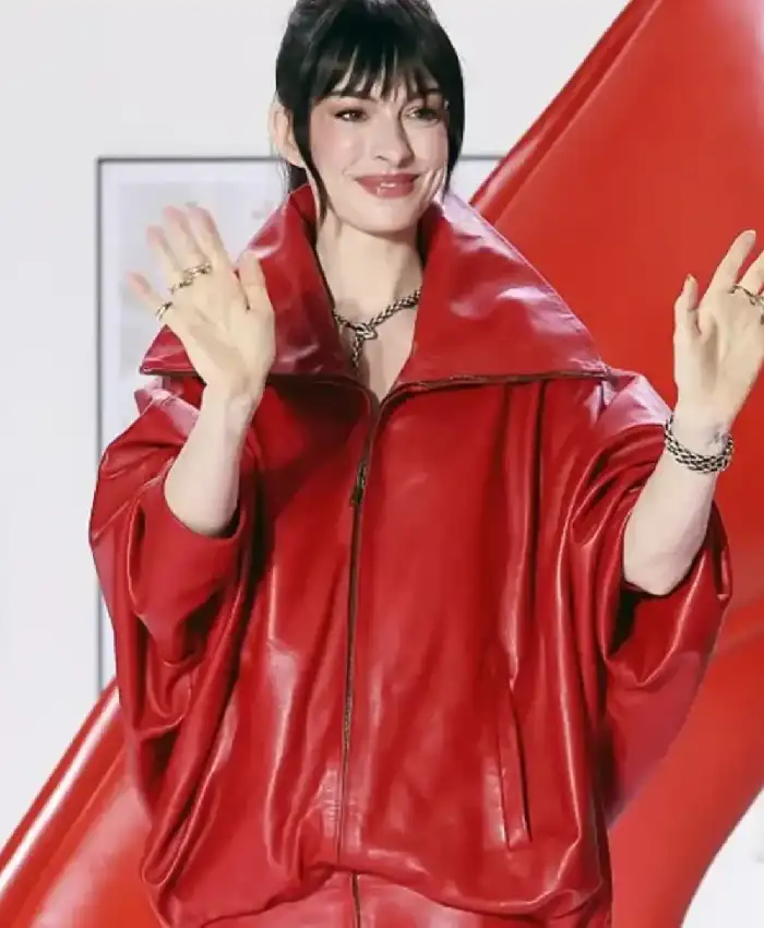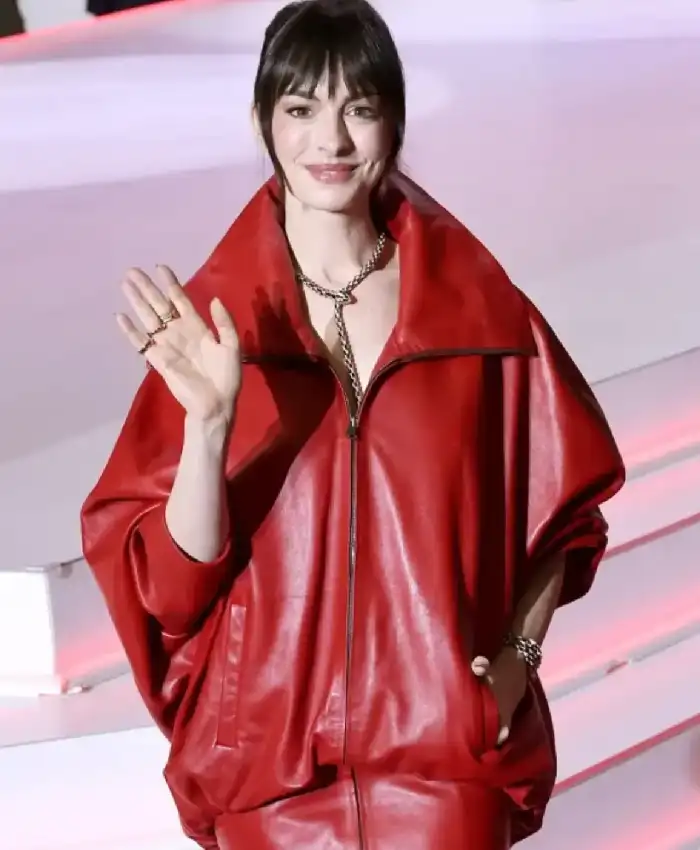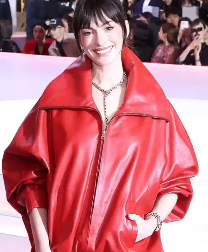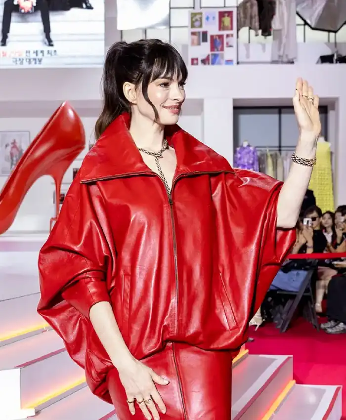 Anne Hathaway The Devil Wears Prada 2 Seoul Premiere 2026 Red Oversized Leather Bomber Jacket For Women