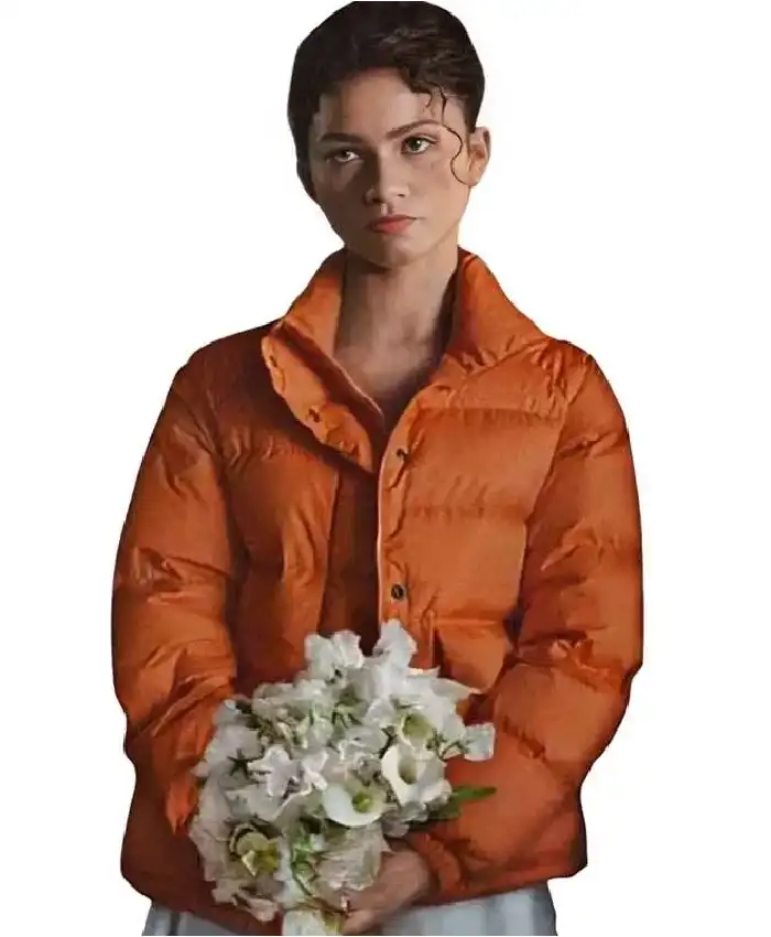 Zendaya The Drama 2026 Emma Orange Puffer Jacket On Sale For Women