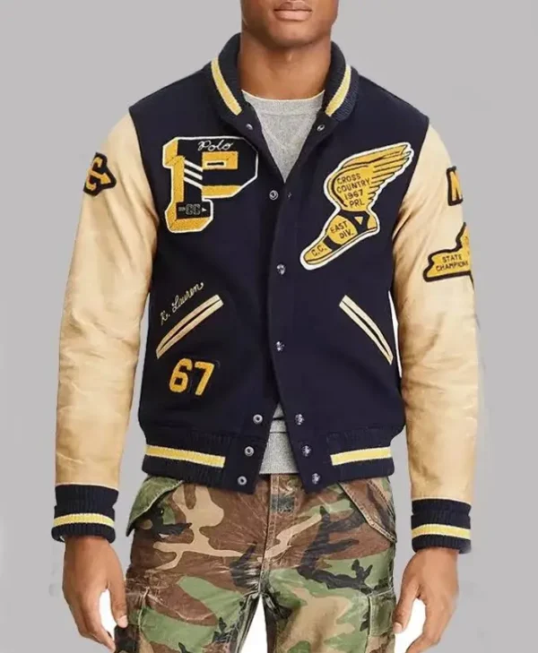 The Iconic Navy Blue Varsity Jacket With Leather Sleeves