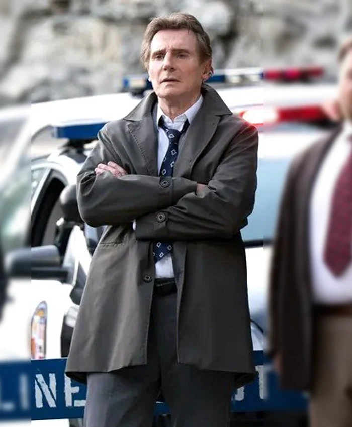 Liam Neeson Movie The Naked Gun 2025 Frank Drebin Jr. Grey Coat