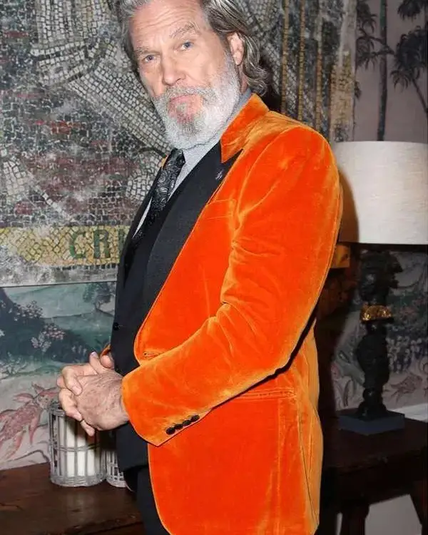 In Season 2 of “The Old Man,” Dan Chase, portrayed by Jeff Bridges, a famous American actor, is seen wearing a vibrant orange velvet blazer on screen during one of the episodes of The Old Man, S4, which adds an elegant yet rough look to his character. The blazer reflects Dan Chase’s experience and dedication and a hint of mystery, which complimented his personality as an escaped former CIA agent.