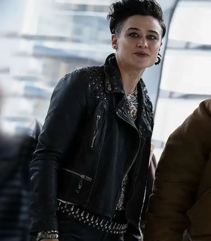 Katy O’Brian Movie The Running Man 2025 Laughlin Black Biker Leather Jacket