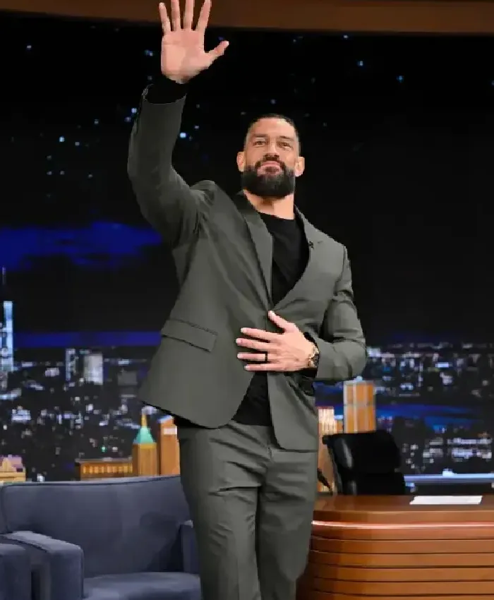 The The Tonight Show Roman Reigns Suit got that clean but powerful vibe. It’s not one of those overly shiny or flashy suits, but still you can’t ignore it. The green color is different, like not something everyone would pick, but somehow it works really well. It feels bold but also controlled, kinda like his personality. You look at it and think yeah, this is not random… this is chosen. It gives off that “I know what I’m doing” kind of feel, even if you don’t say it out loud.