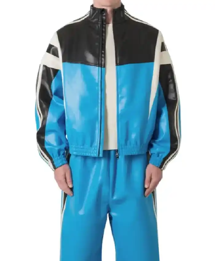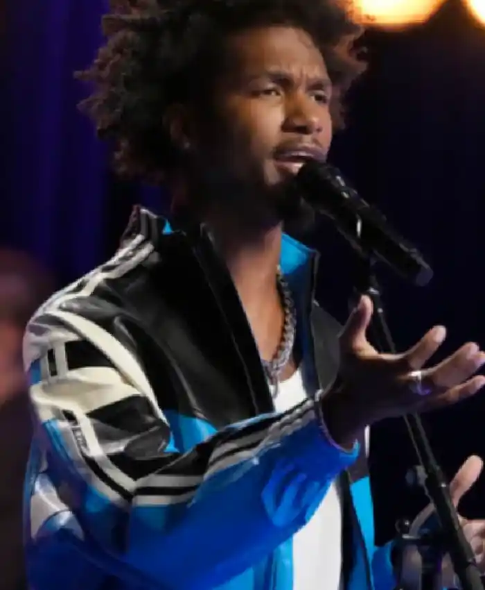 The Voice S29 Mike Steele Geometric Blue Bomber Leather Jacket On Sale For Men