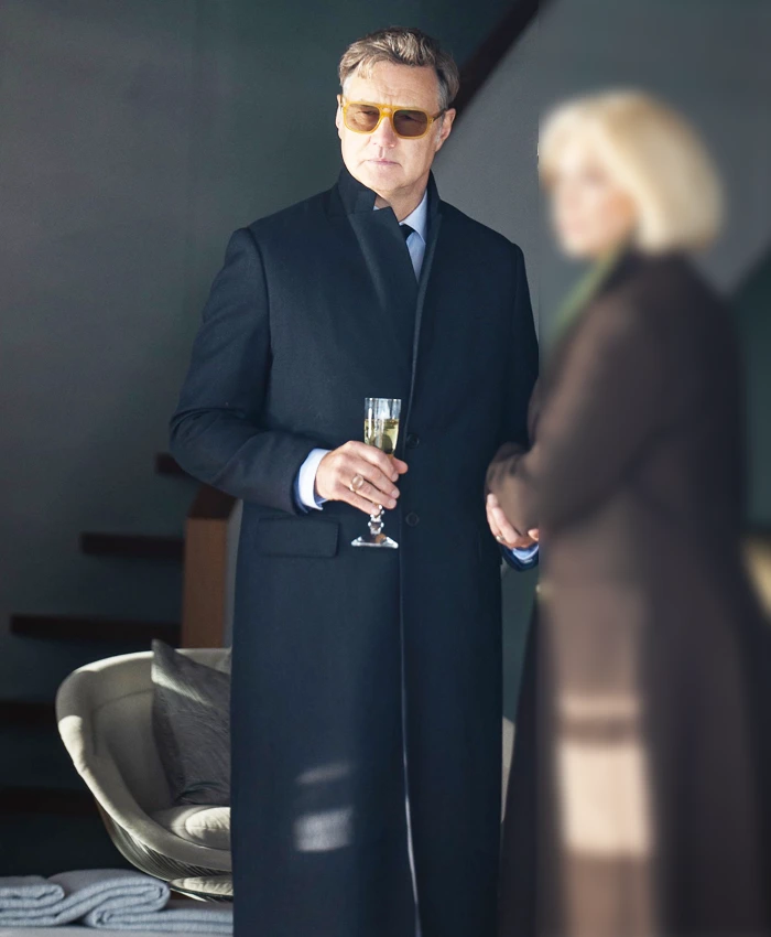 David Morrissey Movie The Woman in Cabin 10 2025 Thomas Heatherley Blue Trench Coat