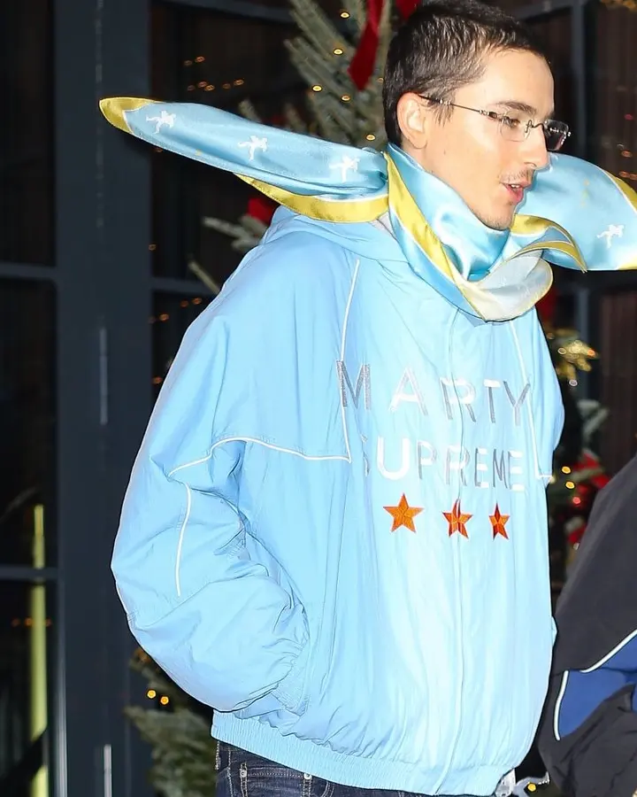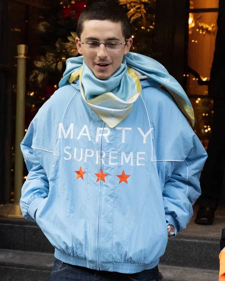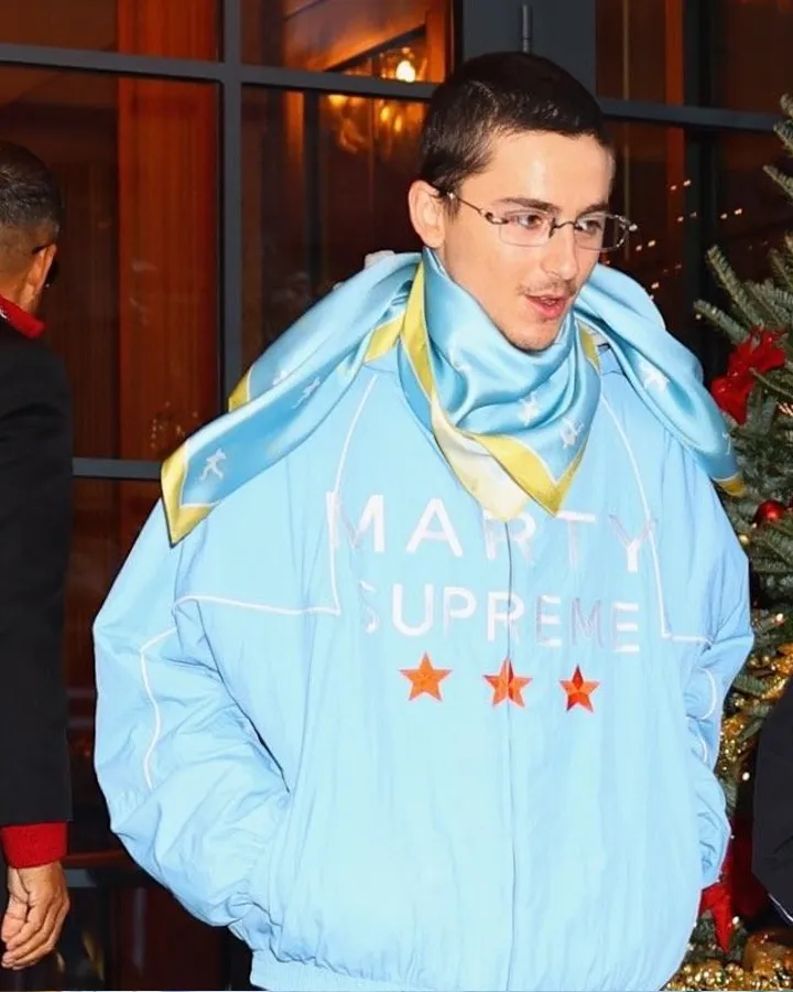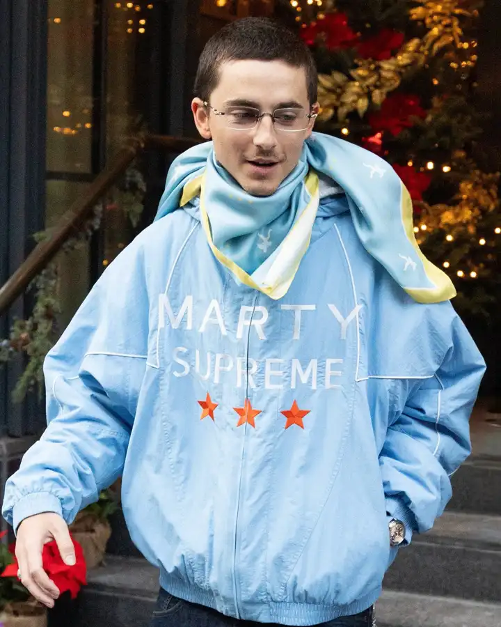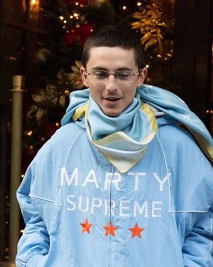 Marty’s supreme legacy in designing premium outfits is still going smoothly, but one thing that adds more attraction and elegance to the jacket is how Timothee carries it. When Timothee Style combines with top notch deisgn of the jacket, the attire will intuitively get a fabulous, incomparable look. Whether you are a fan of Marty or someone who is obsessed with a chic yet relax style, wearables are going to choose this Timothée Chalamet Light Blue Marty Supreme Jacket as your next winter wear for sure.