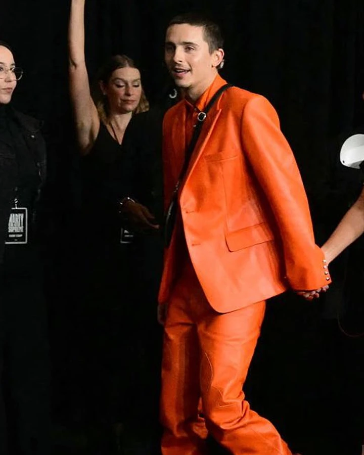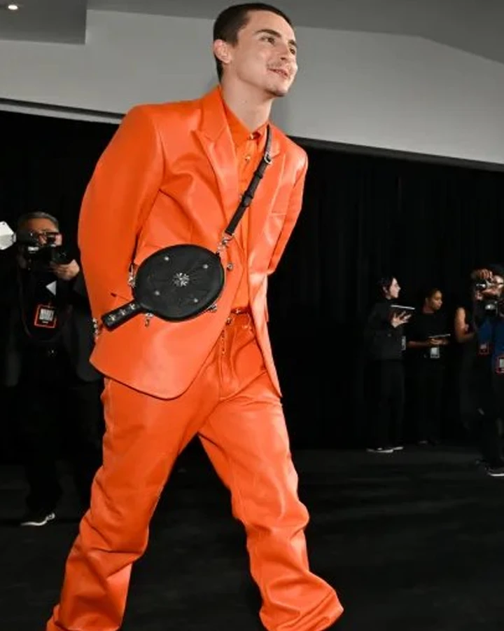 Channel Timothée’s Iconic Style with This Bold Orange Leather Suit