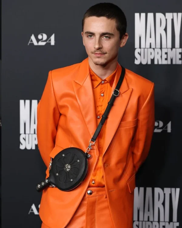 Whether it’s a movie promotion event, an on-stage appearance, a formal family gathering, or a theme party, the Timothée Chalamet orange leather suit is somewhat the most classic outfit you can opt for for a perfect, fashionable look. It is made for both genders and is also available in different sizing options. Buy it now! From the Marty Supreme Jacket Collection.