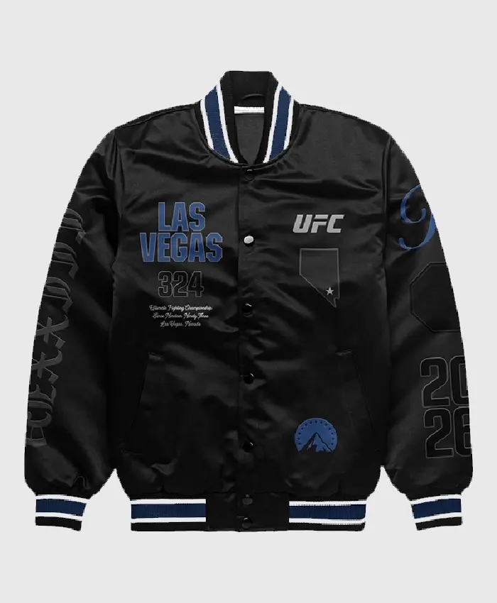 The UFC 324 Las Vegas Black Bomber Jacket is crafted for fans who want to carry that fight-night vibe. Furthermore, this jacket is made from smooth satin fabric that gives it a shiny look. In addition, it features an inner soft viscose lining that keeps you comfortable. It comes with a deep black color, making it easy to match with anything in your wardrobe.