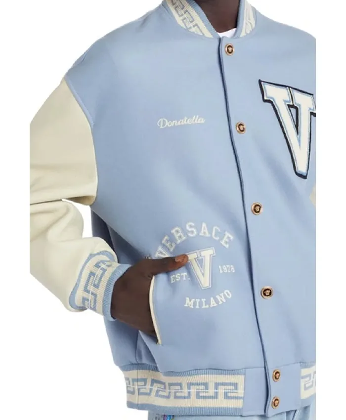 Besides this, it has two outer pockets plus two inner pockets, making the jacket fashionable. You can pair the Versace Blue Varsity Jacket with jeans plus sneakers for a relaxed street look. You may also love wearing this outfit at parties, outdoor moments, daily walks, sports, etc. So, order this appealing jacket from the New Arrival Collections today.