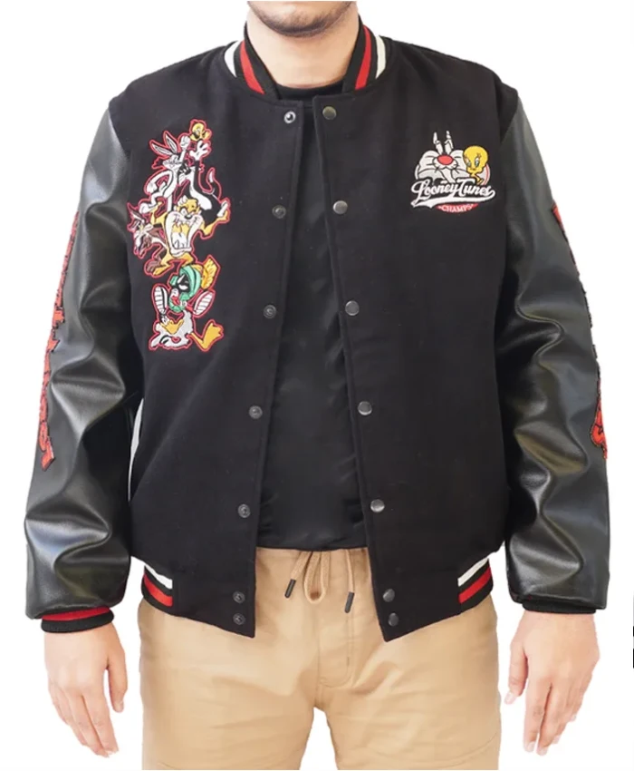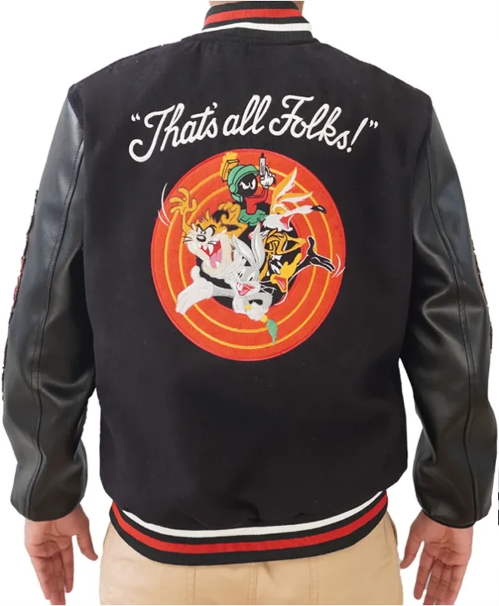 Vintage Looney Tunes Varsity Black Wool and Leather Varsity Jacket For Men and Women