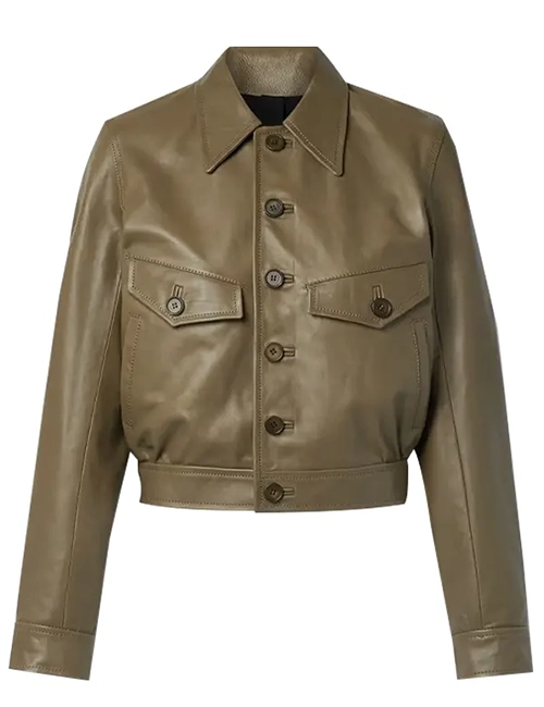 Shop Women Button Down Green Cropped Leather Jacket