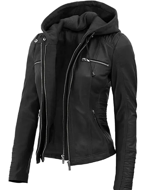 Buy Women Slim Fit Black Hooded Leather Jacket For Sale
