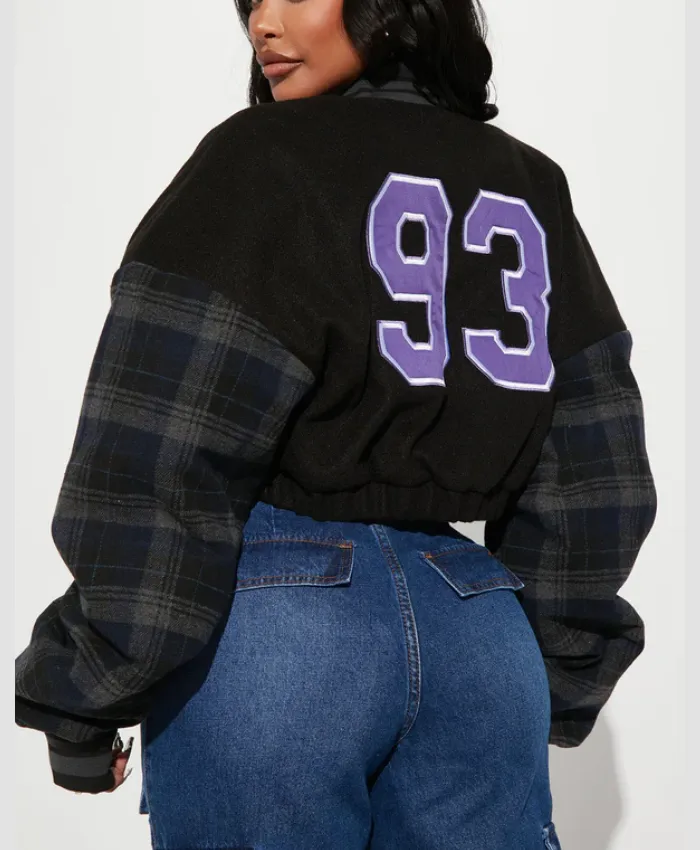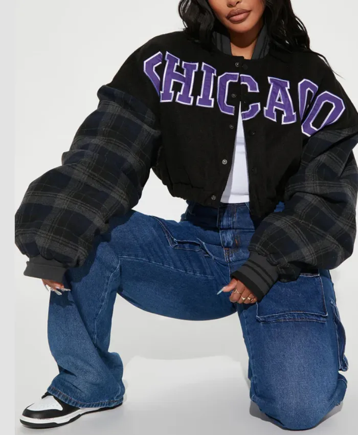 The Women’s Black Chicago Style Cropped Varsity Jacket is a chic and fashionable outerwear piece that combines classic varsity aesthetics with a modern twist.