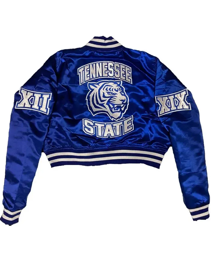 Women’s Tennessee State University TSU Royal Blue Satin Bomber Jacket Collegiate Varsity Jacket For Women