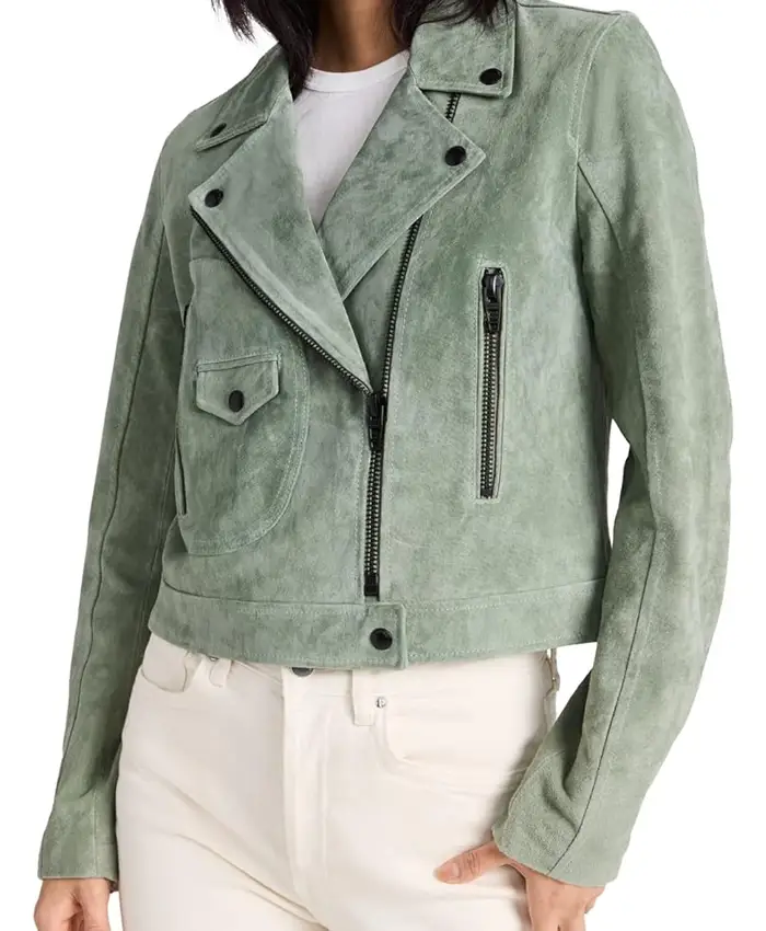 Elizabeth Lail TV-Series You 2025 Guinevere Beck Green Suede Leather Biker Jacket