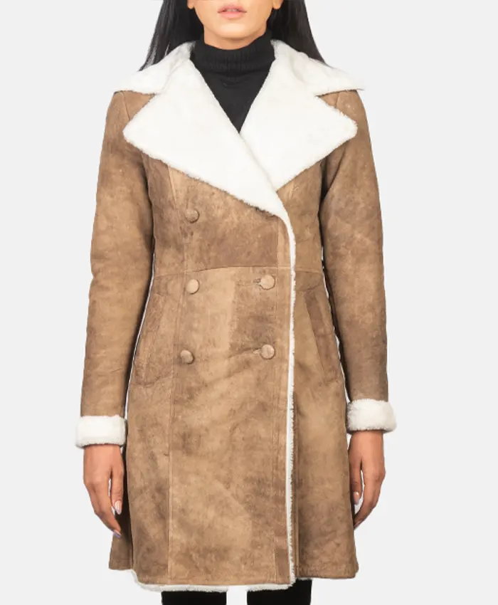 Fabulous Zoe Womens Distressed Sheepskin Shearling Double-Breasted Brown Long Coat On Sale